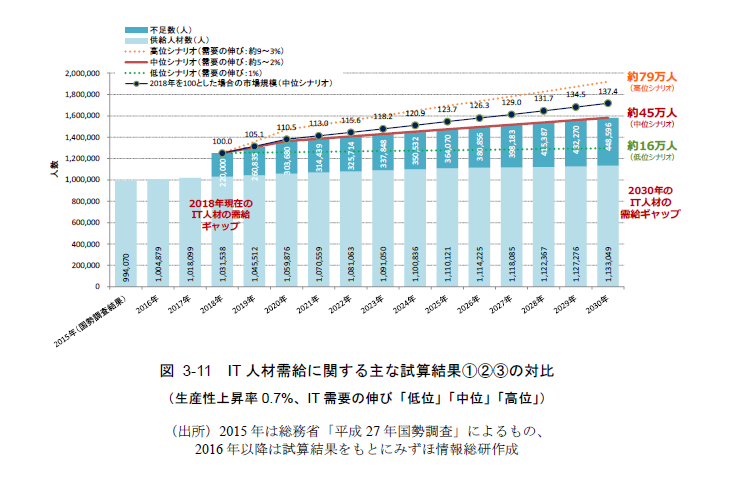 経済産業省がみずほ情報総研株式会社に委託して実施した「IT人材の需給に関する調査(2019年3月)」では、2030年には最大で約79万人のIT人材が不足すると予測しています。