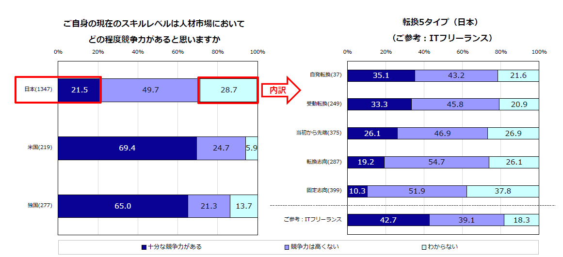 「超売り手市場」とも言える現状に気を良くしたエンジニアの方も多いと思いますが、実は意外な事実も指摘されています。IPA(独立行政法人 情報処理推進機構)が令和3年4月に発表した『デジタル時代のスキル変革等に関する調査』の『統合報告書』には、日本のIT人材が「自身のスキルレベルが『わからない』とする比率が日本では米、独に比べて非常に高い。(引用)」と報告されているのです。