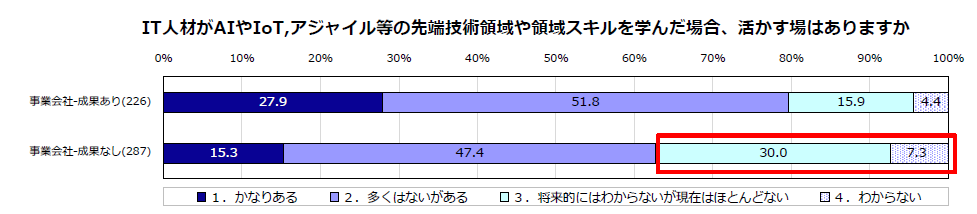 『デジタル時代のスキル変革等に関する調査』には「IT人材がAIやIoT、アジャイル等の先端技術領域や領域スキルを学んだ場合、活かす場はありますか」との質問に企業が答えた結果が掲載されています。