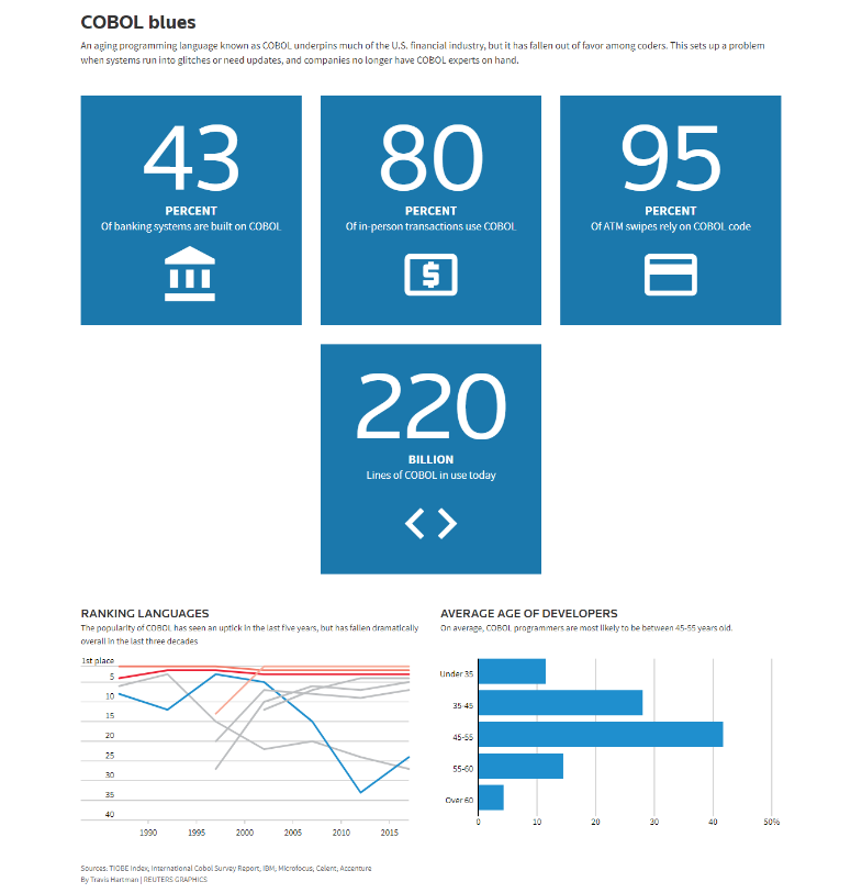 21世紀に入り、COBOLでは別の問題も生じていました。COBOL開発者が高齢化しており、人材不足であることが指摘されていたのです。これらの問題をロイター(REUTERS Graphic)は『COBOL blues』としてまとめ、COBOLプログラマは45?55歳である可能性が高いと指摘しています。