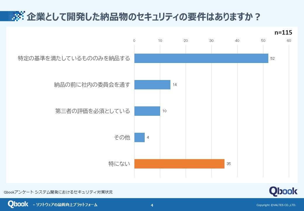 具体的な要件として最も多かったのが「特定の基準を満たしたものを納品する」で52件、次に「納品前に社内の委員会を通す」が14件、「第三者の評価を必須としている」が10件、「その他」が4件でした。
