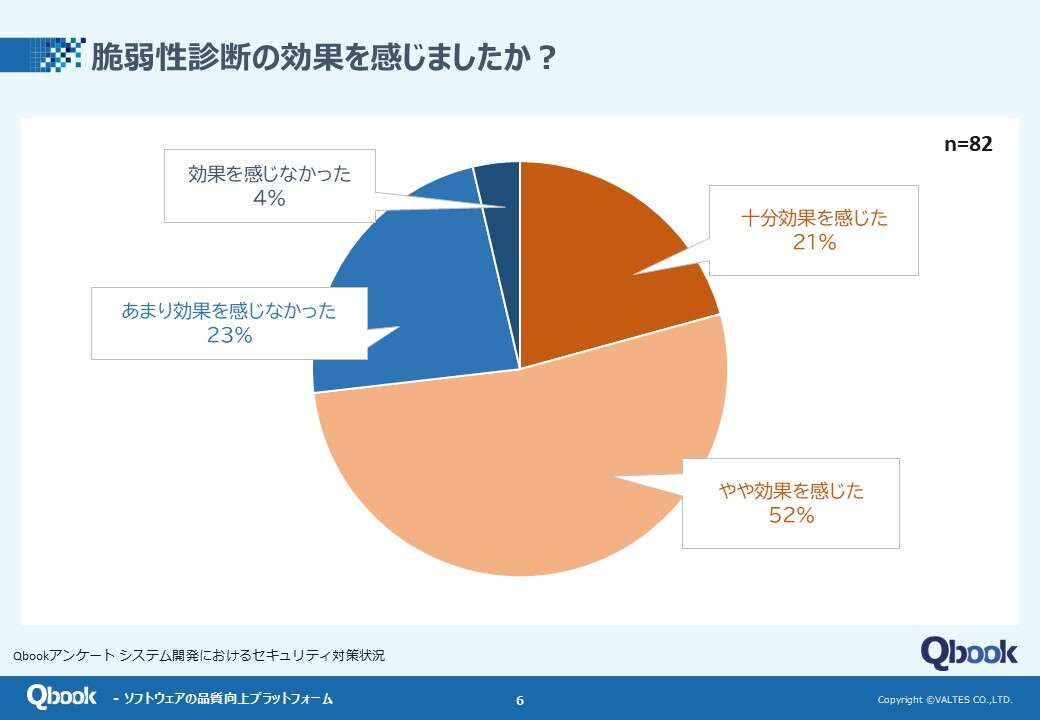 さらに脆弱性診断を実施した方の中で、「十分効果を感じた」と回答した方は21%、「やや効果を感じた」が52%という結果となりました。